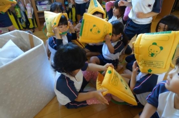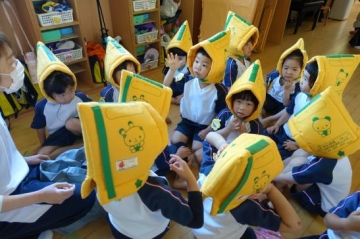 各クラスで防災頭巾を