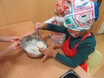 みんなで、生地をかき回して、
