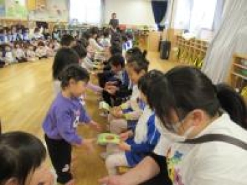 今年度最後となり、今回は全児が一同に集まってみんなで3月生まれの友だちをお祝いしました。