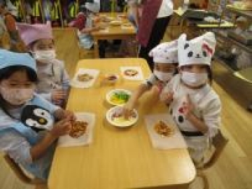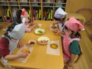 以前、ひまわりぐみさんがピザを作っていたの見て ”自分たちも作りた~い!”と意欲満々!