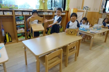ピカピカの机・椅子に園児たちも大喜びです。