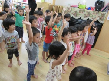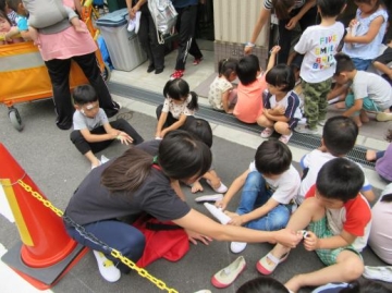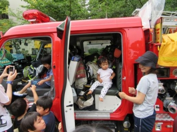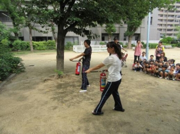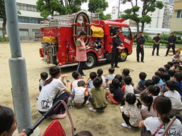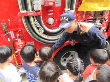 消防署の方もこられて日頃の訓練の様子を見ていただきました。しっかりと先生たちのお話が聞けています!
