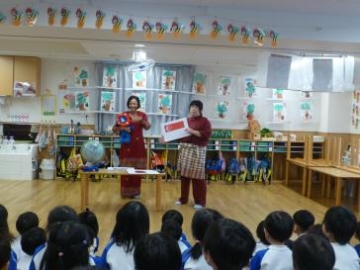 英語のティニー先生がきてくれ、ティニー先生の母国(シンガポール)のことや衣装を見せて頂きました。ほかにもその国の旗や食べ物などクイズ形式で当てっこをして楽しみました。