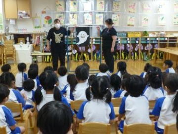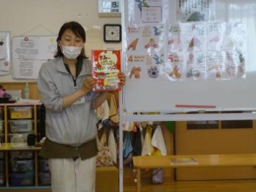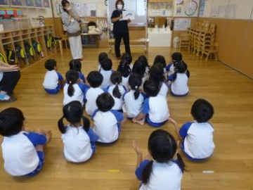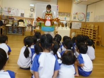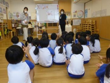 西区保健センターより、4歳児訪問事業の一環として 「手洗い」について 手遊びやエプロンシアター”タヌキさんの手洗い”を見せて頂きました。