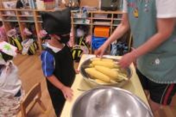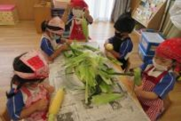 2021年7月12日(月) 食育・さくら組,トウモロコシの皮むき