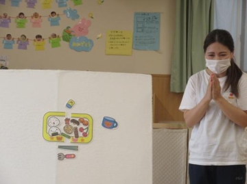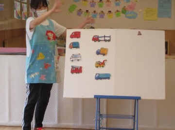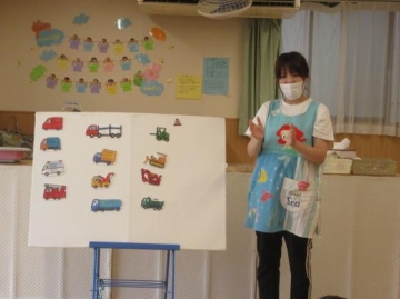 乳児は、”お弁当箱”と”はたらくくるま”のパネルシアターを、手遊びや歌に合わせて観ました。お弁当箱の食べ物を食べる真似をしたり、リズムに乗って元気に歌っていましたよ(^^)/
