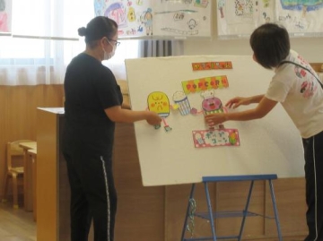 幼児は、まずみんなの大好きな「やだっとちゃん」のパネルシアターを観て、歌を歌いながらやだっとちゃんになったつもりで歌っていました。