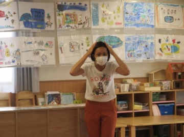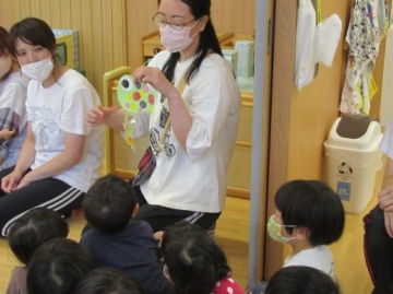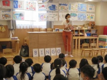 次に、水曜日・金曜日に英語教室に来てくださっている、ティニさんが英語で"BINGO"の歌に合わせてお腹やひざ・頭をたたいて、楽しく歌っていました。