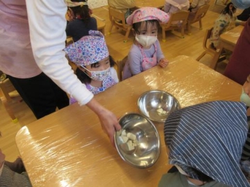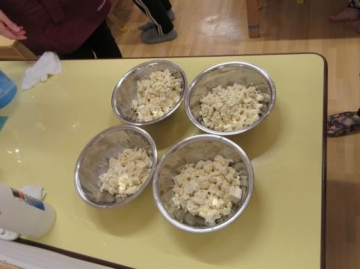 2021年3月22日(月) あひる組さんが食育(豆腐ちぎり)をしました。