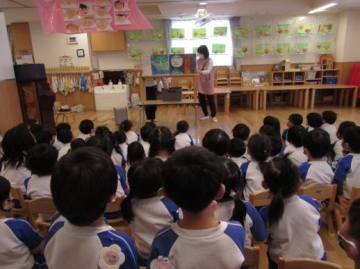 その後、卒園したひまわり組さが作ってくれた大型絵本、「はらぺこあおむし」みんなで観て