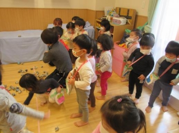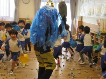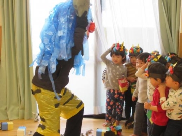 今日は節分!お楽しみ会で1月生まれのお友達をお祝いした後、豆(新聞紙でつっくたもの)を三宝(袋)に入れて各クラススバイ!
