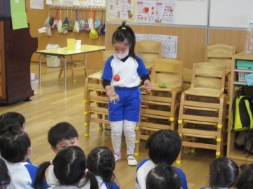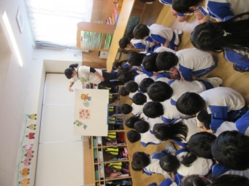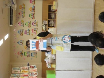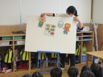 また、幼児さんは、同じ誕生日・3月4日今日で!!お友達が3人いました。お友達を、お祝いしてから得意なものを披露してもらい、(けん玉)ました。その後、「ライオンの買い物」野菜屋さんや魚屋さんに行って、そこで味見することで、お腹がいっぱいに!!たのしいお話でした。