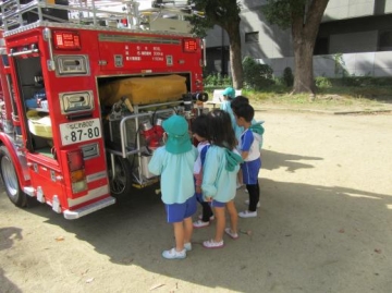 職員による、通報・消火訓練をした後、消防車や消防服・車のしくみを教えてもらい