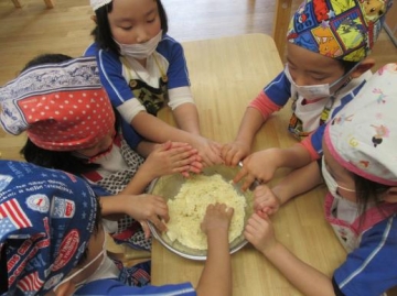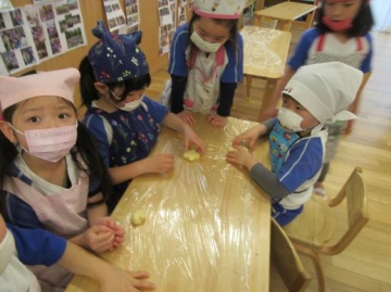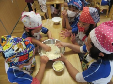 おからと小麦粉を混ぜてバターもいれて混ぜるところが難しい工程だったようだが、グループの友達がボールを支えて協力する姿が見られました。生地が完成すると、次は形作りをしました。みんな自分の好きな形を一生懸命つくっていました。