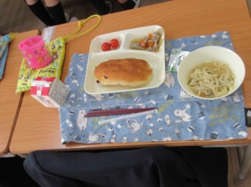 各机の上にはナフキンを敷き、コップ・牛乳パックなどが順に置かれているのも興味深く見ていました。