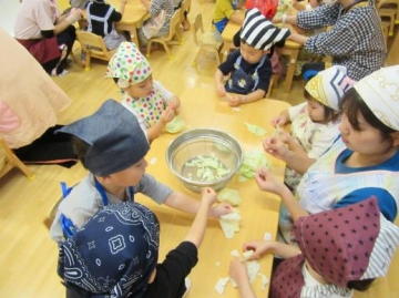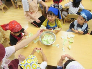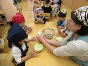 今日は、食育”キャベツをちぎる”作業を一緒にしました。