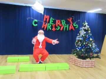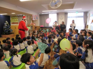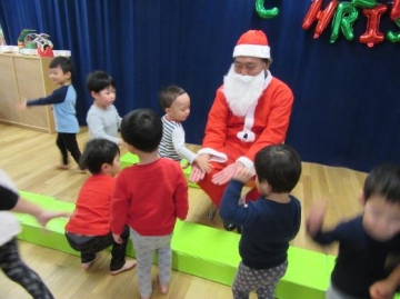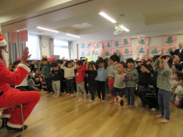 又、お祝いにサンタクロースさんも来てくれ、みんなで♪クリスマスの歌が聞こえてくるよ♪を1~6番までをクラス順に歌い方を変えて 歌ったり、ビックリ箱を見たりして楽しみました。。