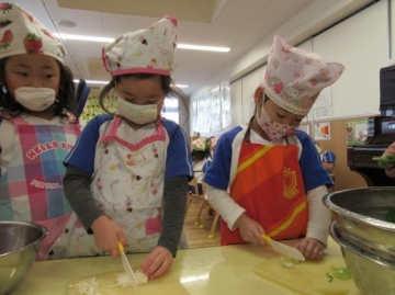 今日の給食の食材を5歳児が包丁お使って刻みました。