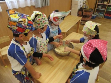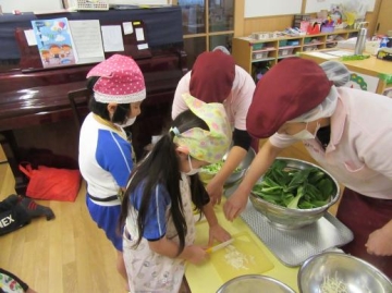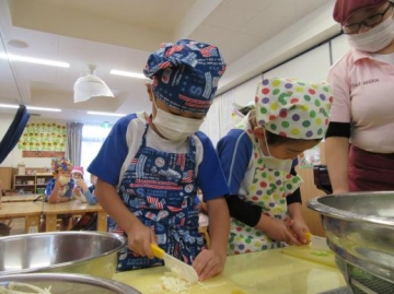 包丁を使うのは2回目だったので子ども達も慣れた手つきで真剣に取り組んでいました。
