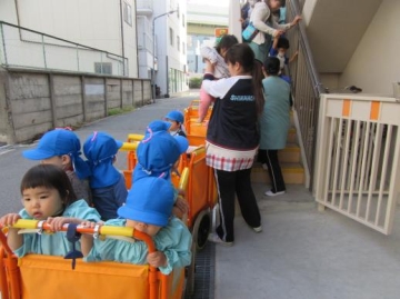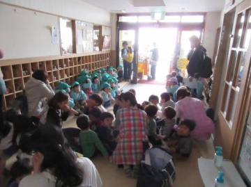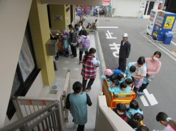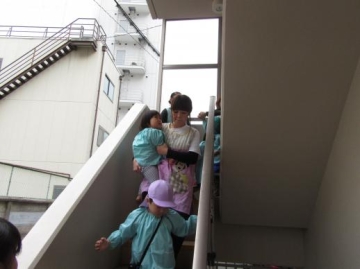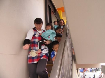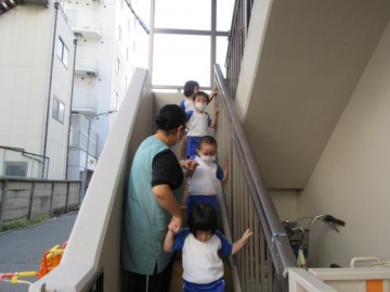 0歳児クラスは、玄関から1歳児~5歳児クラスは外非常階段から避難しました。