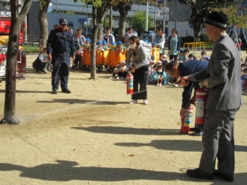 西公園へ避難し、署員の方からの講評を聞いたり、大人が水消火器の訓練をするの見たり、ポンプ車の見学をしたり・・・