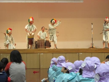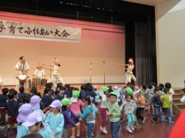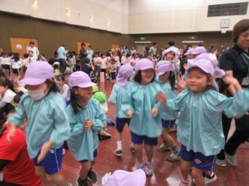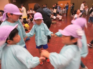 今日は雨が降る中、西成区民センターへ西区・大正区・浪速区・西成区の5歳児が集って文化の理解と各保育園との交流をして来ました。
