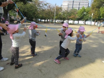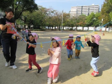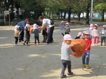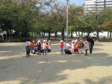 公園では、おやつ取りゲームやキャンディー探しやキャンディー運びゲームやしっぽ取りなど広い公園で友だちと一緒に身体を思いっきり動かせて楽しんで来ました。