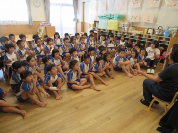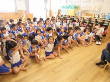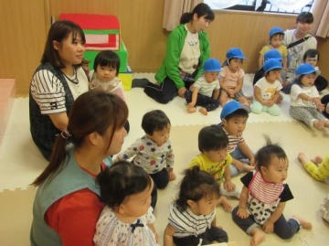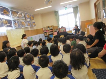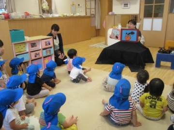 0.1歳児、2.3歳児、4.5歳児と3グループに分けてエプロンシアターや紙芝居や大型絵本など
