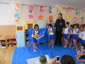 すいかのお姉さんが大きな丸いすいかを3個もってきてくれ、みんなで割って食べました。