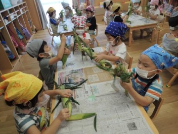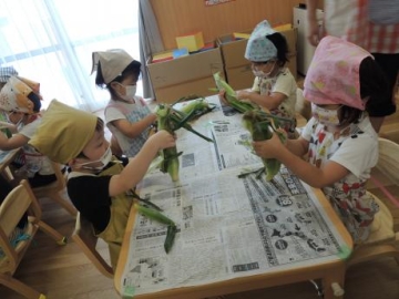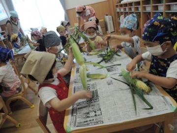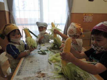 3時のおやつ ”ゆでとうもろこし” をすみれ組の子ども達が皮向きにチャレンジしました。