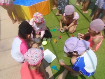 2グループで氷遊びとプールに入るチームに別れて屋上で交流をしました。