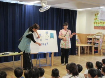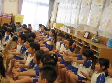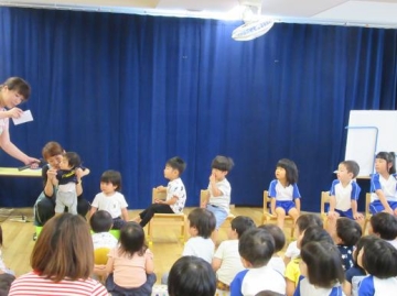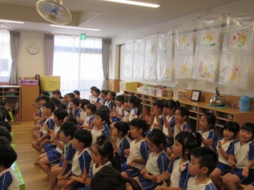 お楽しみ会に全児が集って5月生まれの友だちをお祝いしました。