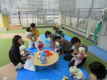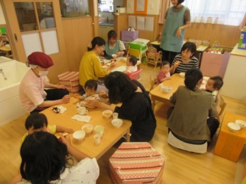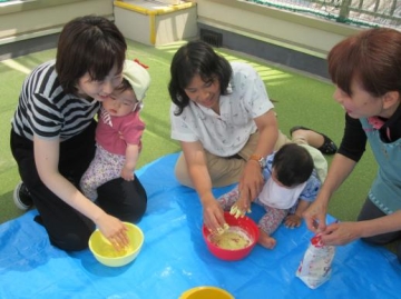 その前に、親子で小麦粉ねんどを作って粘土の感触や氷の感触遊びをして遊びました。目の前の氷や小麦粉ねんどに キョトン!・・としている子もいましたがお母さんと一緒なので嬉しそうにしていました。