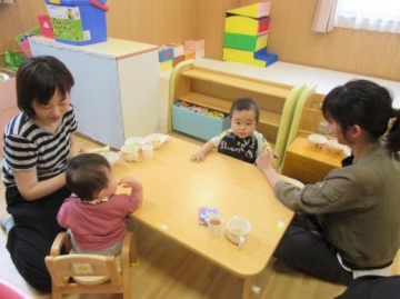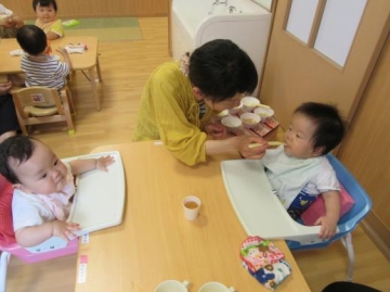 保育園で食している給食内容を実際に子ども達に食べさせていただきながら、味付け・硬さ・大きさなど家庭との違いなど見ていただきました。