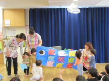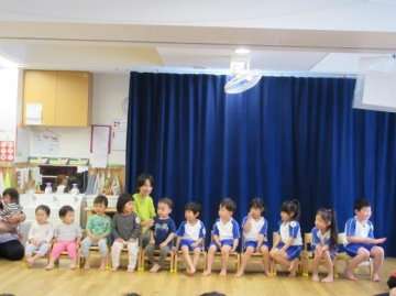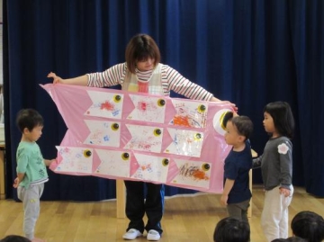 12名の4月生まれの友だちを”はらぺこあおむし”の紙芝居を見たり、うたをうたったりしてみんなでお祝いしました。