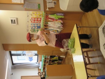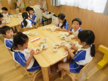 給食時は、「ひまわりぐみが皮をむきました。」とお当番が園内放送をし、みんなで美味しく頂きました。