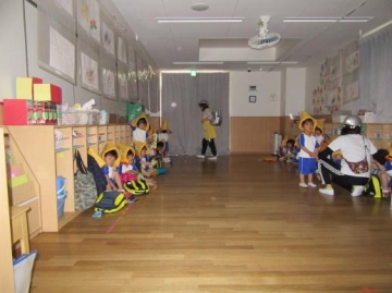 緊急エリア情報のサイレンを聞いてから、各クラス机の下・ロッカー・窓から離れるなどの訓練を行いました。