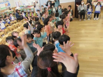 5歳児が卒園を前に他クラスの子どもたちからお別れ会に招待されました。大きくなったら何になりたいかをみんなの前で発表してくれました。「警察官!・保育士さん!ケーキ屋さん!・・・」みんなのなりたい夢はいっぱい!夢がかなうと良いですね!!