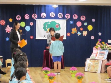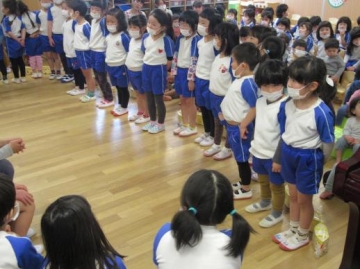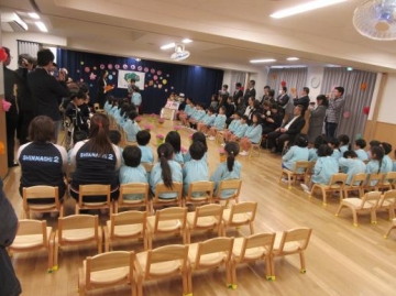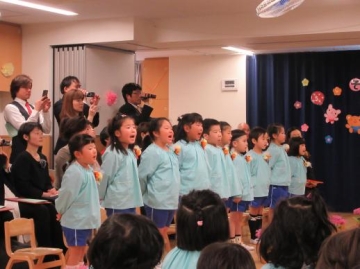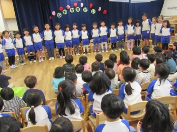 保護者や3.4歳児や来賓に見守られ、おわかれのことばと歌をうたい保育園の思い出を懐かしさや寂しさに浸っていました。