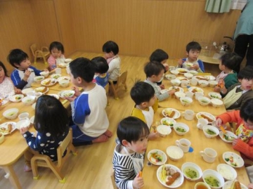 給食は、ひまわりぐみが数人ずつ別れ各クラスへ行って一緒に会食をし、楽しく過ごしました。