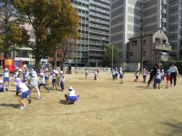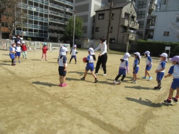 新町保育園ぱんだ組とさくら組が島津公園でリレーやドッジボールをして交流をしました。