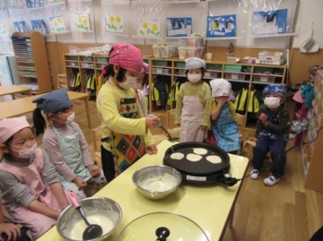 ボールを押さえる・泡だて器で混ぜる・お玉ですくってホットプレートで焼く行程を自分たちで体験しました。