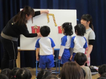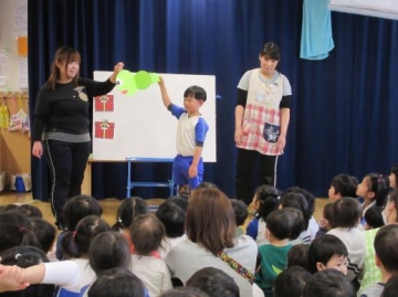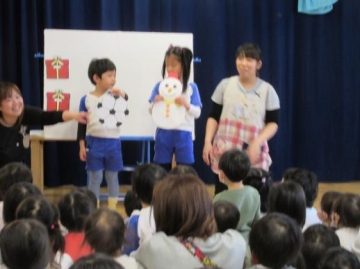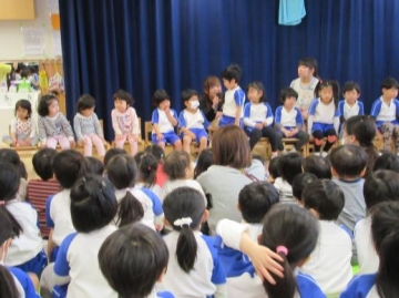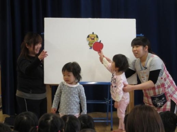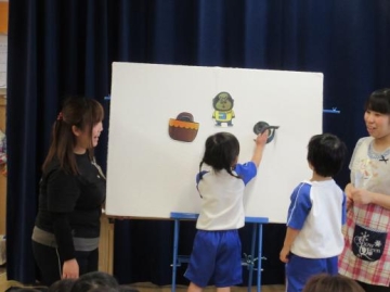 パネルシアター「どっち?どっち?どっちかな?」を誕生児の子ども達も参加して、みんなであてっこをしたり、歌をうたったりして楽しみました。