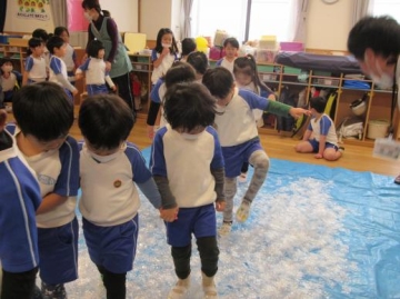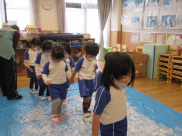 ガラスの破片が落ちている道をどのよう歩くか(ペットボトルの刻んだものを見立てて)また、簡易の担架にクマのぷーさんを乗せて運ぶ体験も経験してみました。