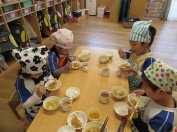 4つのテーブルに分かれてすり鉢を押さえる人、ごまをする人の順番を決めて交代にすっていき、あえた野菜をトングを使って自分の皿に取り分けて食べました。