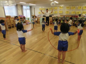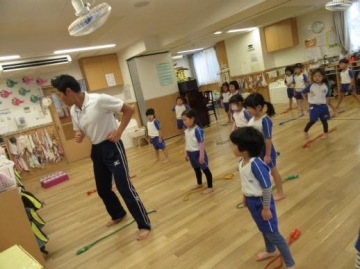 無料体験の一つで、体育専門講師から4歳児は縄跳びの跳びかた、コツなどを教わりました。