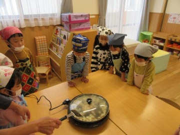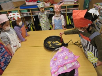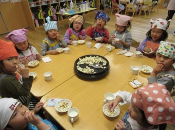 子ども達は、コーンが弾ける音や弾ける様子を興味深く見ていましたが、混ぜるときに種がはじけだしたのにはみんなびっくり~!
