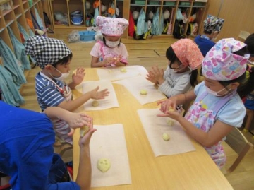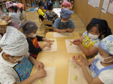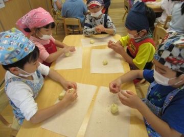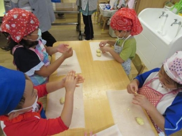 今日のおやつの”バタークッキー”を小麦粉・バター・砂糖を混ぜてクッキーの生地を作ることから始めました。