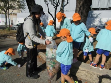 大阪マラソンによるクリーンUP作戦に3..4.5歳児クラスが参加しました。日頃利用している公園今回は、島津公園の清掃をしてきました。