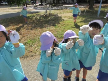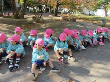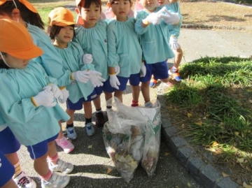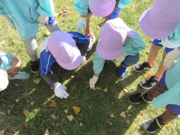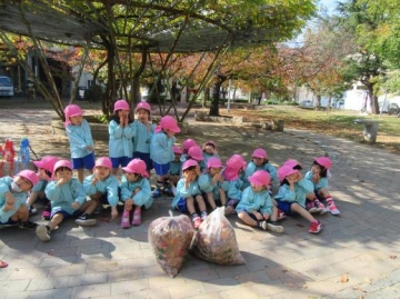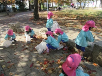 みんな手には軍手をはめ、はりきって公園掃除をしていました。大きいクラスは、ごみを中心に、すみれ組は枯れ葉を中心に集めていました。袋いっぱいになると「せんせーみて~!」と嬉しそうに見せに来ていました。